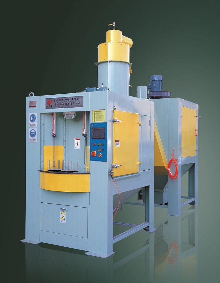 本設(shè)備是根據(jù)我公司針對轉(zhuǎn)動軸和處理要求而專門設(shè)計(jì)的轉(zhuǎn)盤式自動噴砂機(jī),完全適合貴公司所提供的產(chǎn)品。根據(jù)貴公司對產(chǎn)品效率的要求,本機(jī)共大轉(zhuǎn)盤共設(shè)置4個區(qū)域(90度一個區(qū)域),每個區(qū)域設(shè)置2個工件裝夾工位。大轉(zhuǎn)盤每轉(zhuǎn)動90度區(qū)域一停,噴砂區(qū)域內(nèi)共布置12支普壓高速噴砂槍,在噴砂區(qū)1個區(qū)域 2個噴砂加工位,各布置6支噴砂槍對工件需噴砂部位做擺動噴砂加工,噴槍可根據(jù)加工需要,隨意調(diào)整其噴射角度,其自動化程度較高。 該機(jī)由主機(jī)、旋風(fēng)分離器、除塵箱、抽風(fēng)管道、空氣壓縮系統(tǒng)(客戶自備)、電氣系統(tǒng)等組成。本機(jī)配置12支普壓高速噴砂槍,根據(jù)工件的大小可擺動噴砂,也可定點(diǎn)噴砂,靈活方便實(shí)用。